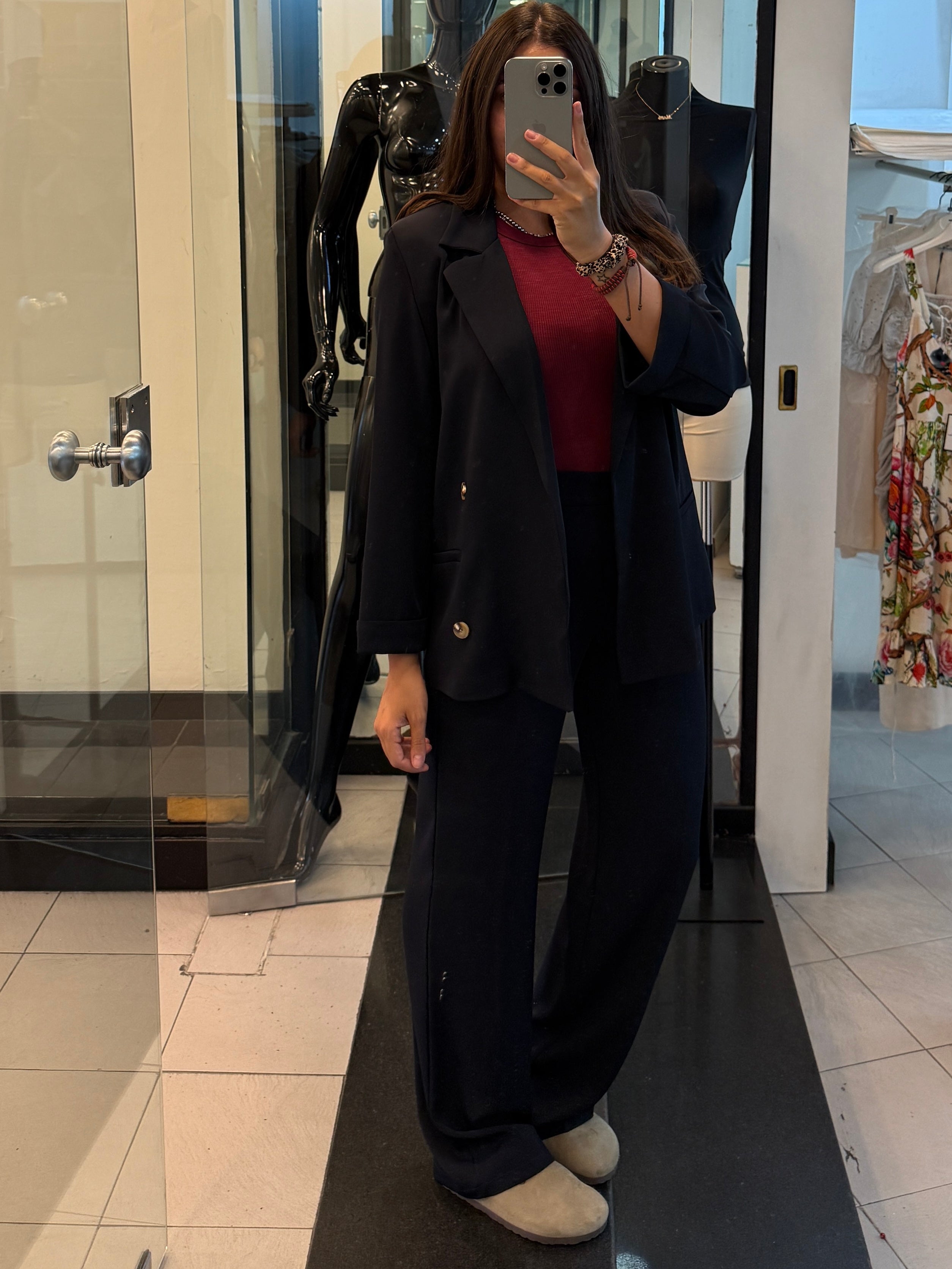 Tailleur morbido con pantalone wide leg e giacca con bottoni (finti)